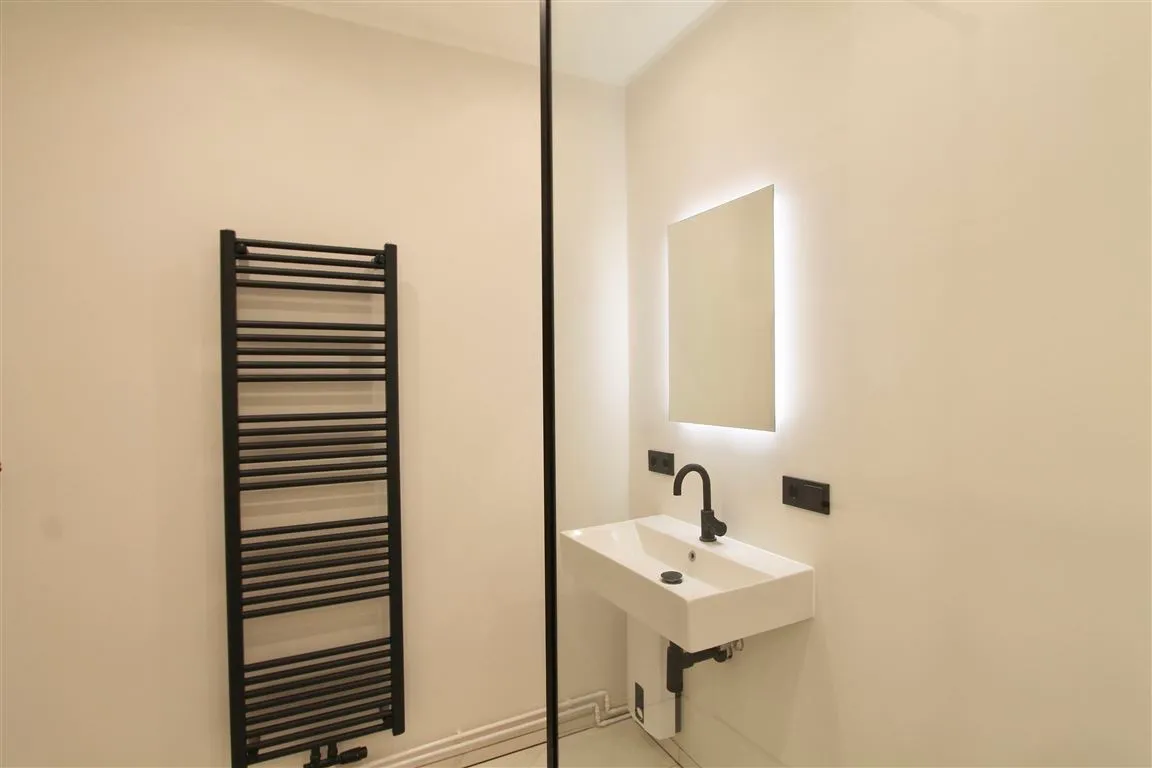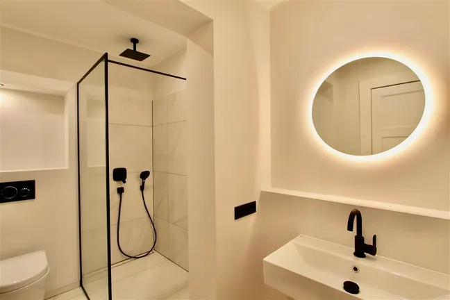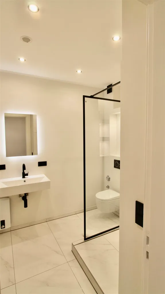 Duschbäder mit großer Regenbrause und Handbrause in schwarz, Handtuch-Heizkörper in schwarz, großflächige Fliesen, Fußbodenheizung mit Thermostat, großer LED-Wandspiegel, hochwertige Hans Grohe Armaturen, WC mit Absenkautomatik und einer schwarzen Drückerplatte und Unterputz-Armaturen