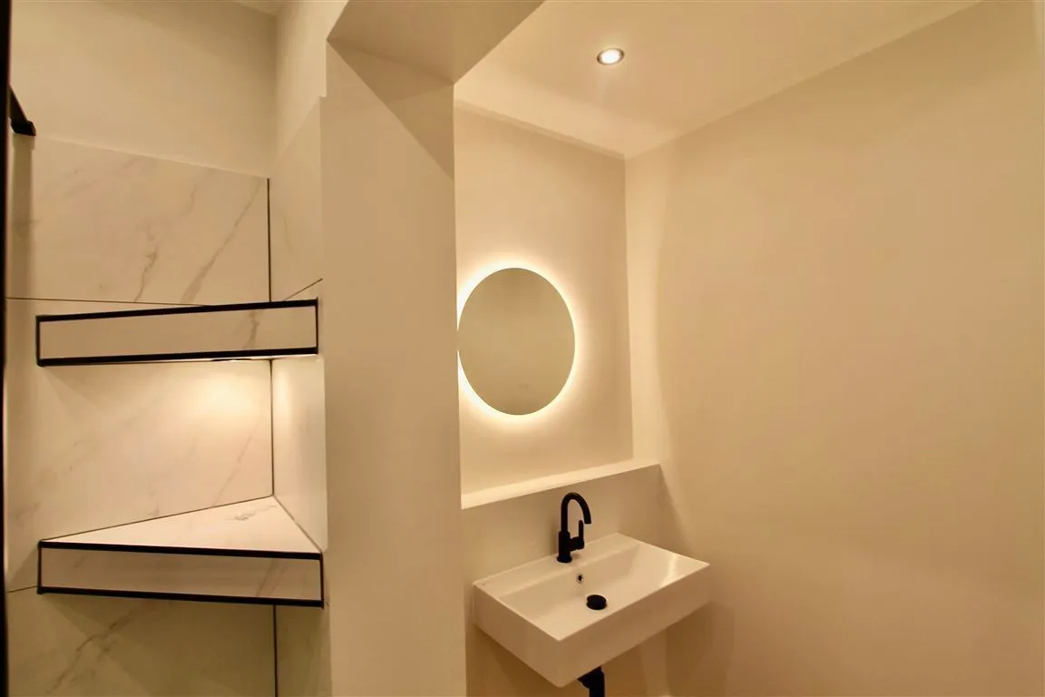 - Abgehängte Decken mit schwarze Einbaustrahlern und indirektem Licht , LED-Fächer im Badezimmer