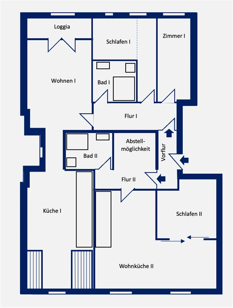 Die Wohnung(en) ist/sind vielfältig nutzbar. Wohnung Nr. I + II sind für sich selbständige Einheiten, können aber auch zusammengelegt werden.